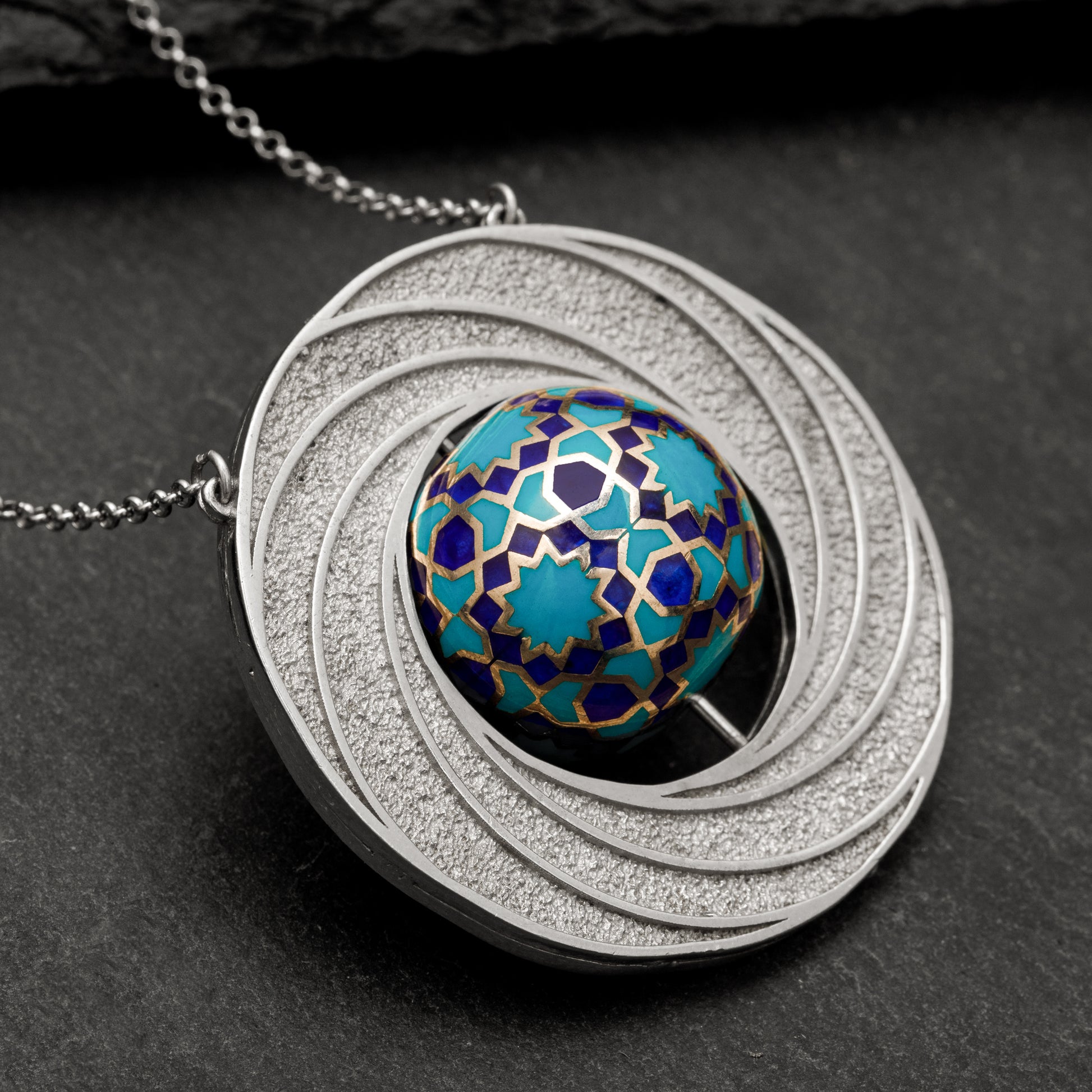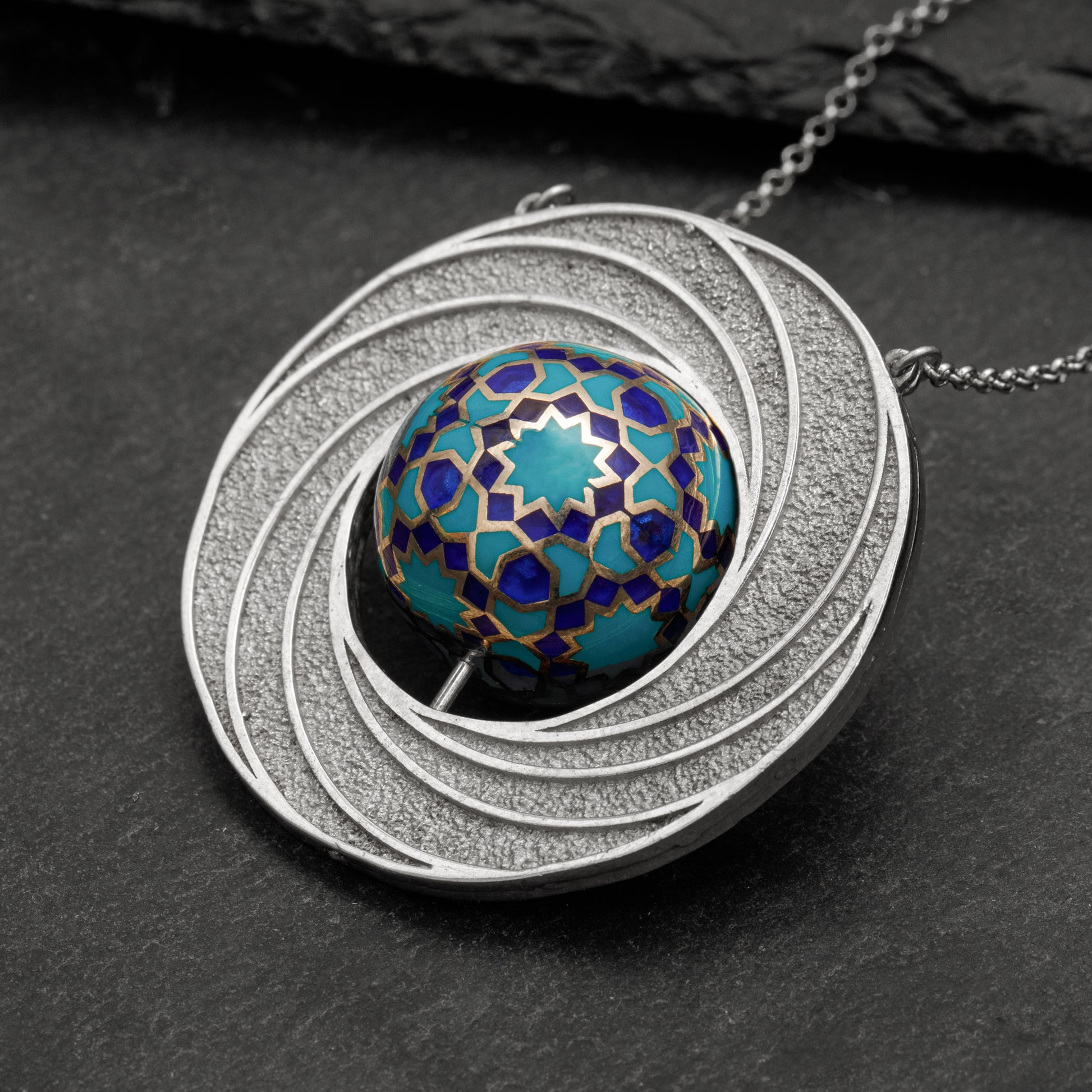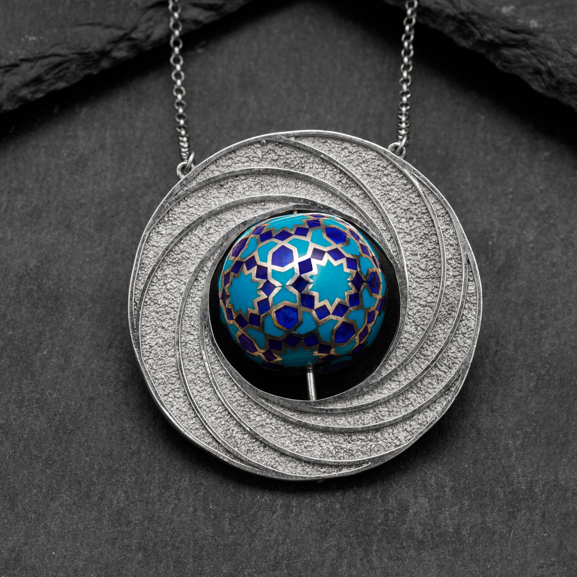 Selçuklu mimarisinden ilham alan zarif geometrik desenlerle tasarlanmıştır. Gümüş çerçevesi, dönemin estetik anlayışını modern bir dokunuşla birleştirirken, ortasındaki mine işçiliği detaylarıyla büyüleyici bir görünüme sahiptir.